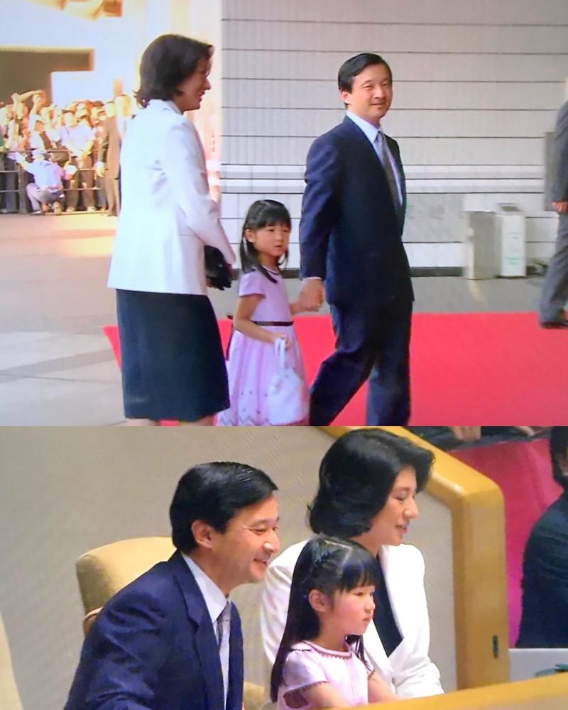 天皇一家进入会场,观众席上响起了热烈的掌声和欢呼声,他们一家笑着向观众挥手致意。天皇一家在贵宾室观看激烈的比赛,每当决出胜负时,他们都报以热烈的掌声。