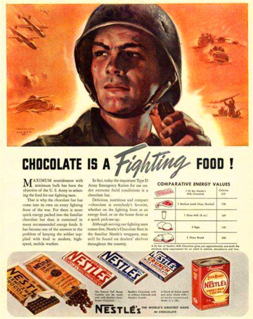 在喜欢甜食的人眼睛里面,巧克力可以说是不少人的最爱,那种在口中浓厚醇香,再慢慢划开的感觉,简直不要太过瘾,同时它也蕴藏着极高的卡路里,这种特性,被美国军部所看重,因此在美国参战后,就开始大规模投入,士兵们因为战争来不及吃饭时,就可以吃吃巧克力来补充能量。