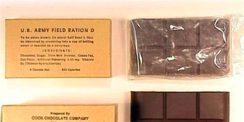 不过解决的办法还真让好时的食品专家山姆给找到了,他在巧克力里面加入了大量的燕麦粉和玉米粉,这些成分极大的破坏了巧克力的口感,同时还让其在高温下避免了融化,此外巧克力工厂还不放心,在巧克力里面减少了蔗糖,而是大幅度提高了可可的加入。让巧克力变得味道极为苦涩且难以咀嚼。这个巧克力受到了美国军方的欣赏,不仅达到甚至还远远超出了“口感仅仅比比煮熟的土豆略好”的标准,因此它立刻在军中开始大规模的推行,到了1942年在美军中,基本都有好时所生产的“d巧克力条”和热带专用的“热巧克力条”