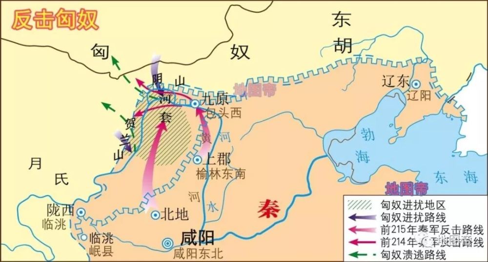 春秋战国时期,诸侯争霸,秦国奋六世之余烈,公元前221 年秦始皇横扫六国一统天下,开启了华夏历史上第一个大一统的王朝---秦朝。但雄才伟略的秦始皇并不满足于此,继续开疆拓土,南攻百越、北却匈奴。公元前215 年,秦始皇派大将蒙恬率30万大军北击匈奴,夺取河南地,公元前214年,蒙恬又渡河夺取黄河以北的高阙、阴山、北假中等地区。匈奴头曼单于率众北逃,史书记载“匈奴势慑,不敢南面而望十余年”。秦朝在取得的河南地设了三十多个县,阴山以南地区纳入大秦帝国控制之下。秦朝为了抵御匈奴、巩固在河南地的统治,在北方修筑长城和秦直道。