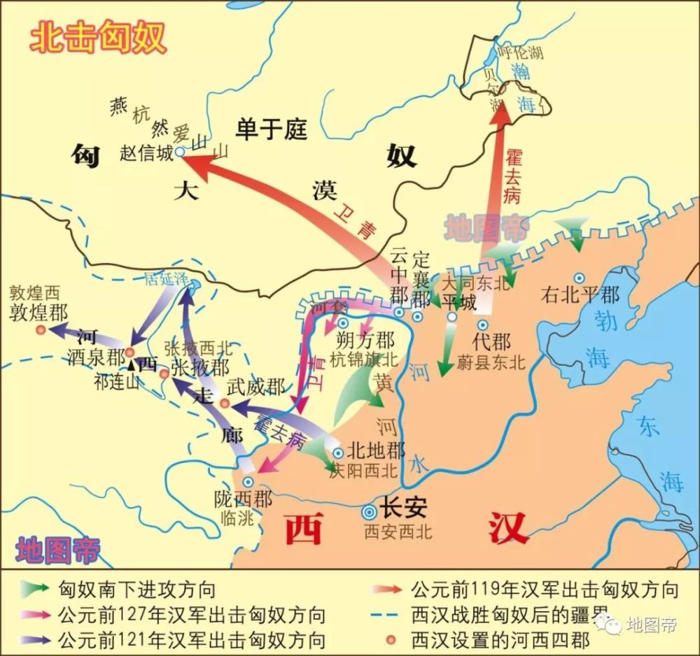 此后,汉武帝又花血本在后套平原这种当时一穷二白的地方建朔方城,置朔方郡,并迁徙山东贫民70多万以垦殖戍边,从此河南地纳入汉帝国疆域之中。虽然成本很高,但是足见汉武帝的战略眼光之深远,因为河南地包括阴山对中原文明来说实在太重要。《九边考》中也说过:“……故阴山为御边要地,阴山以南即为漠南,彼(匈奴)若得阴山,则易以饱其力而内犯,此秦、汉、唐都关中,必逾河而北守阴山也。”