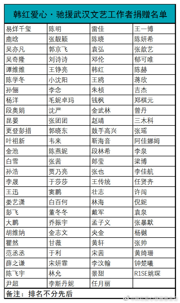 1月26号晚,韩红爱心慈善基金会通过官博公布了此次驰援武汉的明星完整名单,据官博汇总的捐赠名单获悉,共有易烊千玺,鹿晗,吴亦凡,郭京飞,吴奇隆刘诗诗夫妇,袁弘张歆艺夫妇,陈赫、陈学冬、孙俪、蒋欣、张靓颖、朱桢、李念、贾乃亮、任贤齐、王迅等103位明星好友加盟此次活动。