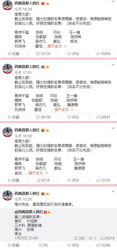从25日晚间,到1月26日一整天,韩红老师不断在微博持续发博,更新最新加入驰援武汉活动的明星好友,1月26日晚间韩红老师公布了驰援武汉明星完整名单,郑钧,白百何,易烊千玺,张靓颖等人被特别鸣谢,甘薇令人意外。