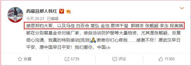 而值得一提的是,在此次公布的名单当中,郑钧易烊千玺张靓颖等人被韩红特别鸣谢,据韩红老师发博透露称,在这次活动中要特别感谢郑钧大哥以及冯佳、白百何、袁弘、金池、易烊千玺、郭晓冬等人,都在分别替基金会对接厂家,亲自洽谈防护服等大量物资,尤其是张靓颖,反复细心沟通,令韩红老师特别感动,称“谢谢你们心疼我,感激不尽”。