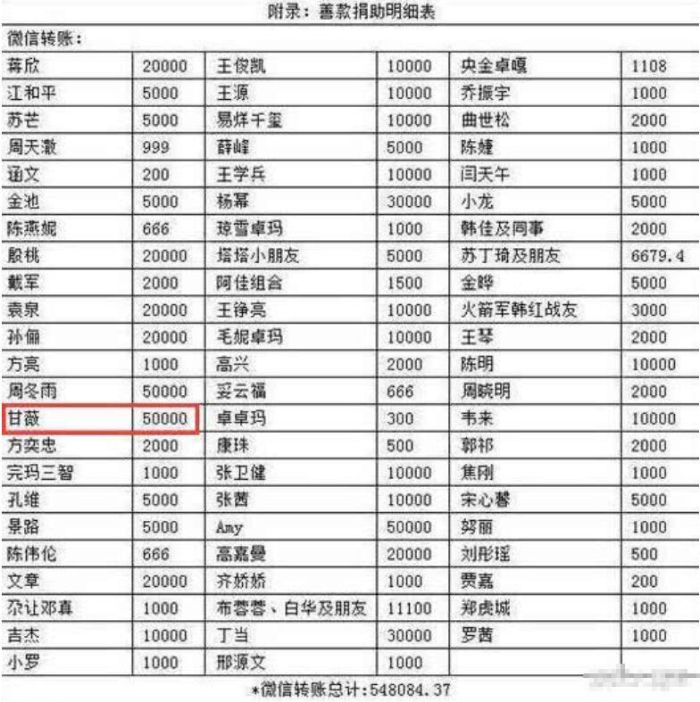 据悉此次韩红发起的这项活动,103位明星共计捐款1150万元,平均一下每人至少也得捐10万,在此之前甘薇在韩红的另一场活动中曾微信转账5万,这次甘薇捐款数额肯定也不会少于五万,对于名单中甘薇的出现令人觉得非常意外道“甘薇居然....”,众人也纷纷为她竖起一个拇指赞。