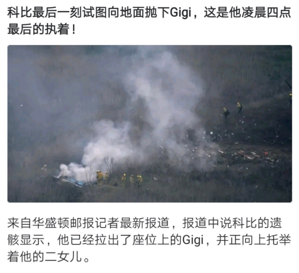 有报道指出,科比在坠机前,曾试图推举女儿吉安娜,想从座位把女儿拉出来并抛到地面上,可惜最终无力回天,父女二人连同机组人员坠入山区。