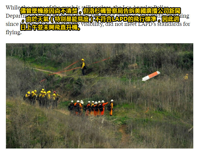 目前,无法判断直升机是谁的,当日的天气能见度很低,不符合洛杉矶警察局的飞行标准,因此周日上午没有驾驶直升机救援。