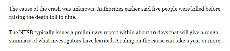 据美国媒体报道,国家安全运输部通常会在十天内发布初步报告,该报告只是简要描述调查员所了解的情况,至于事故原因可能需要一年或者更长。