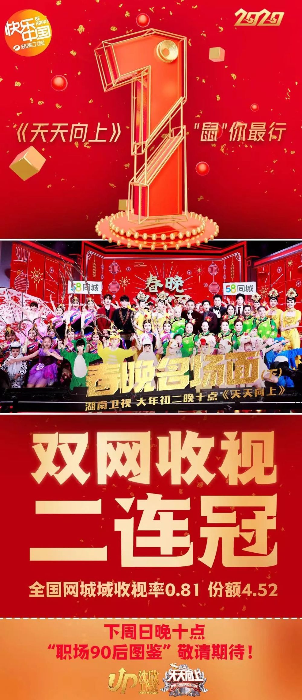 37年来,春节联欢晚会逐渐演变成春节的标志性符号,陪伴每家每户度过除夕夜的团圆时光。1月19日和26日湖南卫视播的《天天向上》以“春晚名场面”为主题,邀请诸多“春晚面孔”齐聚,献给观众一场情怀盛宴,勾起观众对春晚的美好回忆,收视连续两周夺得双网冠军的成绩,打响鼠年开门红,并获得观众的一致好评,其中,#倪萍采访赵丽蓉落泪#和#巩汉林回忆赵丽蓉#成为当晚的热议词。