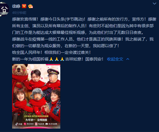 徐峥在明知道春节档必定扑街的情况下,选择在疫情爆发的时候单方面毁约然后把版权卖给了字节跳动,从而赚到了6.3亿人民币,可以说是很理性的一次止损,不仅把利润赚到了手,还把口碑也赚到了。