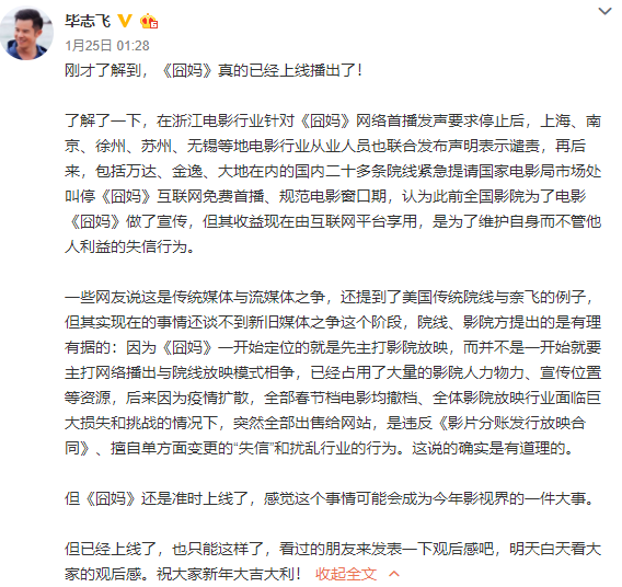 毕志飞导演认为:《囧妈》基本上在春节档是面临惨败,预售非常的不理想,票房也就1000多万,大概分成也就300万,可以说是血亏,可是在春节档电影全部撤档以后,《囧妈》的免费播放成为了春节里最靓的那一道风景。