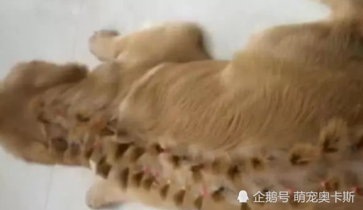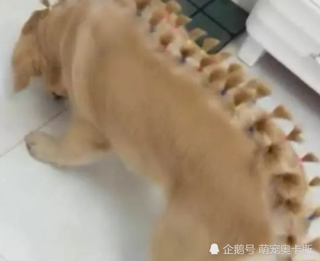 有一天主人出门的时候,就把这只金毛交给了自己的熊孩子,结果下班回来一看主人顿时后悔哭了,只见这个熊孩子把金毛身上的毛发都弄成了一个个小辫子,本来这是一只小公狗,没想到变得娘娘气的,看起来也有一番乐趣。