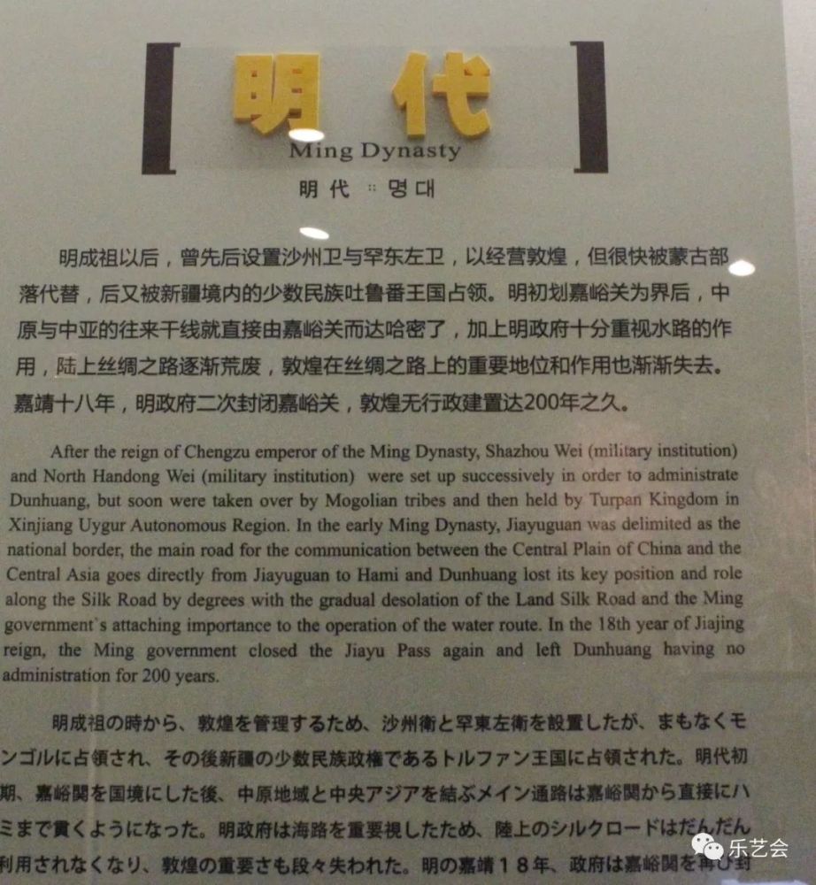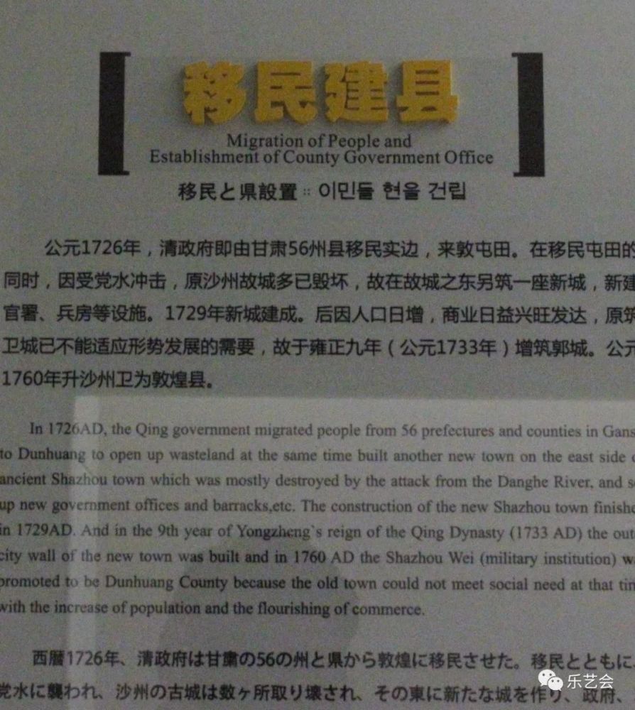 敦煌市博物馆基本陈列展览整体布局分一序厅和五个展厅,第一展厅两汉敦煌的大发展,第二展厅魏晋南北朝敦煌的继续发展,第三展厅隋唐时期敦煌的繁盛,第四展厅吐蕃与五代及宋、元、明时期,第五展厅清代对敦煌的开发。