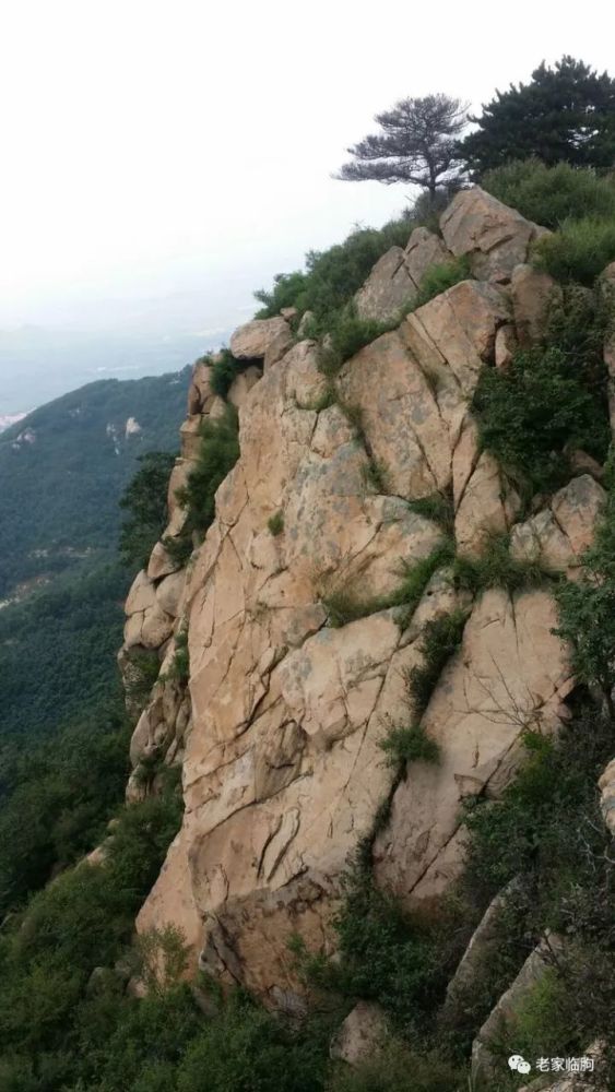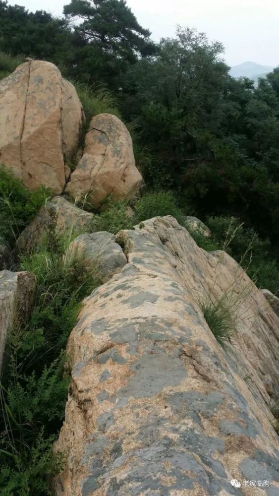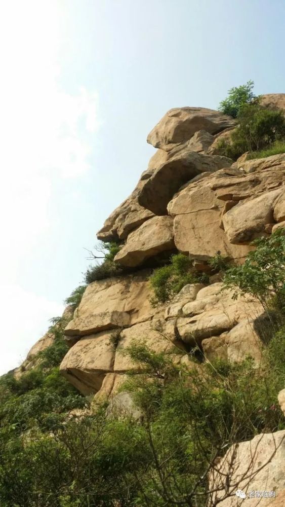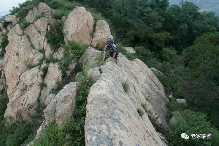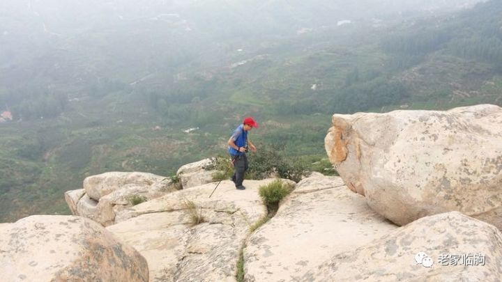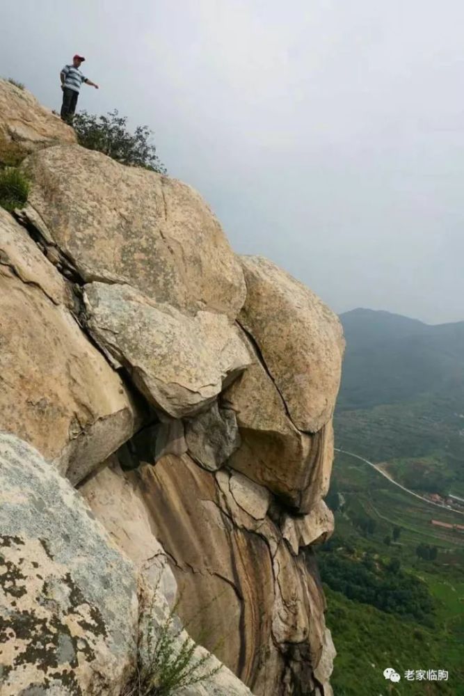 进军边崮!边崮最突出的一个字就是:险!险的你心惊肉跳,险的你无路可走!整座山只有从南端断崖上有一条险峻的攀岩路可到山上庙宇,庙宇以北,也是无路可走,整个山头都是斜插的片石。这是南端,我们是从这里下来的,而上,我们是从北侧悬崖上滑湿的岩石上硬闯出来的,可谓步步惊心,提心吊胆!