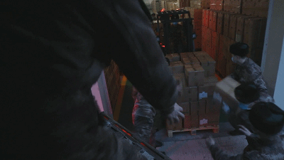 这里是沈阳联勤保障中心某储供基地,在我身后,70余名官兵正在连夜奋战,快速装载一万五千套防护服,积极发往防疫物资集结地。