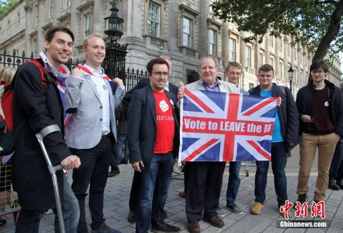 资料图:当地时间2016年6月24日,英国“脱欧”公投计票结果揭晓,多数投票者赞成英国脱离欧盟。图为“脱欧派”支持者在伦敦市中心庆祝。中新社记者 周兆军 摄