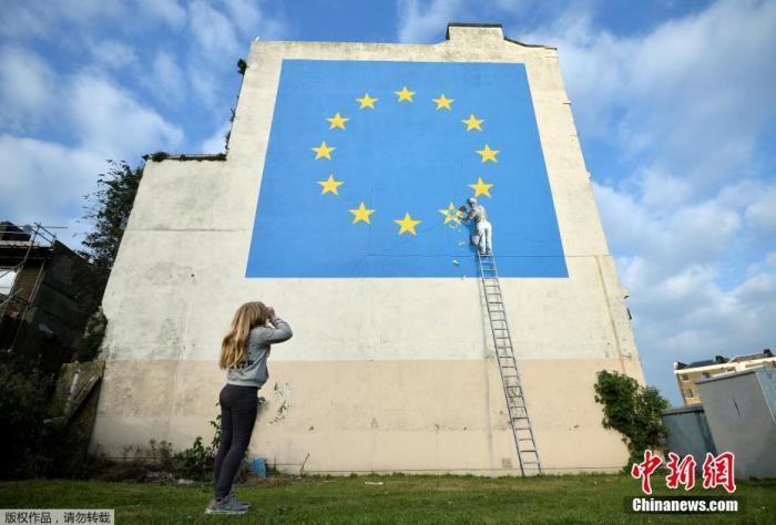 资料图:当地时间2017年5月7日,英国多佛,一名街头艺术家班克西创作了一幅画,画面中一名工人正从欧盟1星旗帜上抹掉一颗星,寓意着英国将脱离欧盟。