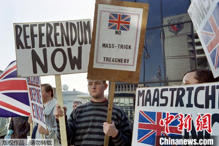 资料图:图为1992年10月16日,《马斯特里赫特条约》的英国抗议者。
