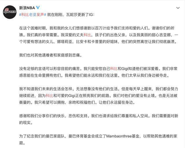 很多粉丝看了这段话都说,这么坚强,不愧是科比最爱的女人,有的粉丝还说,失去了科比,换我们来保护你。
