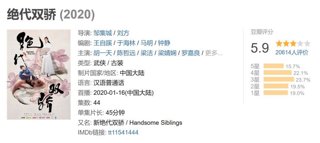 与以上两部剧不同,《绝代双骄》并非改编自新时代的网络小说,而是改编自古龙先生的经典武侠作品。该剧由爱奇艺、完美世界影视、华策影视、完美建信影视出品,郭靖宇监制,胡一天、陈哲远、梁洁、梁婧娴等主演,2020年1月16日在CCTV8首播,爱奇艺网络独播。