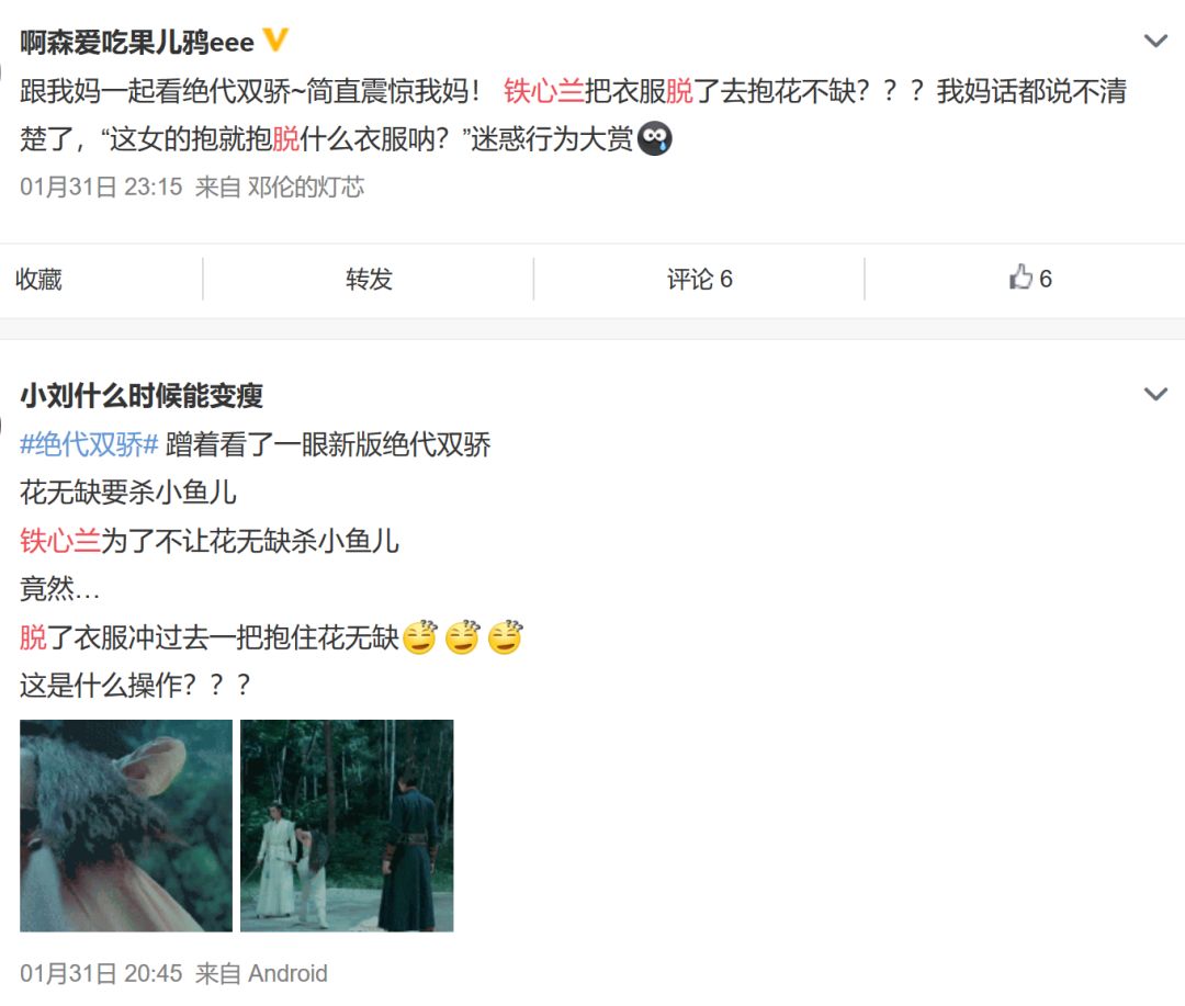 《绝代双骄》原著中,铁心兰与小鱼儿、花无缺两人都有感情纠葛。某一次在危急关头,铁心兰直接脱掉衣服抱住花无缺,好让小鱼儿逃走。2020版把这个桥段拍了出来,观众只想艾特迷惑行为大赏。