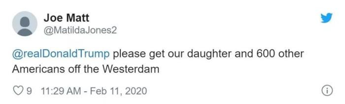 另一个名叫“Joe Matt”的网友@美国总统特朗普,希望他“救救生病的女儿和600多名困在船上的美国人。”
