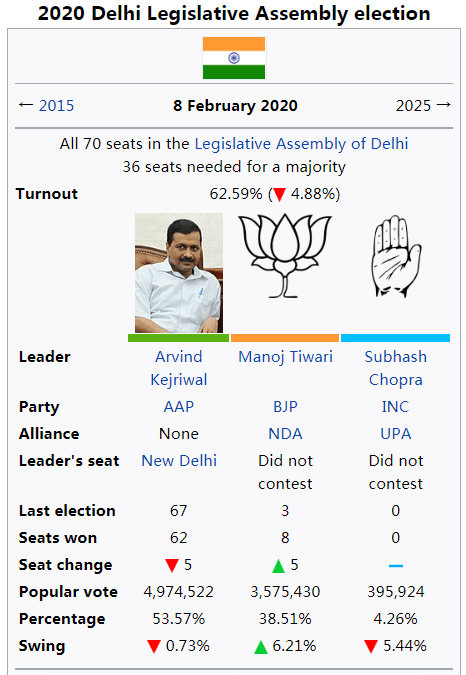 2月8日,印度首都德里地区近920万选民走入投票站,选出德里地区新一届立法会成员。11日晚计票结束,最终由阿尔温德·凯杰里瓦尔(Arvind Kejriwal)带领的平民党(AAP)赢得62个席位,击败了印度人民党(BJP,获8席)和国大党(UPA,0席),第三次主政德里。