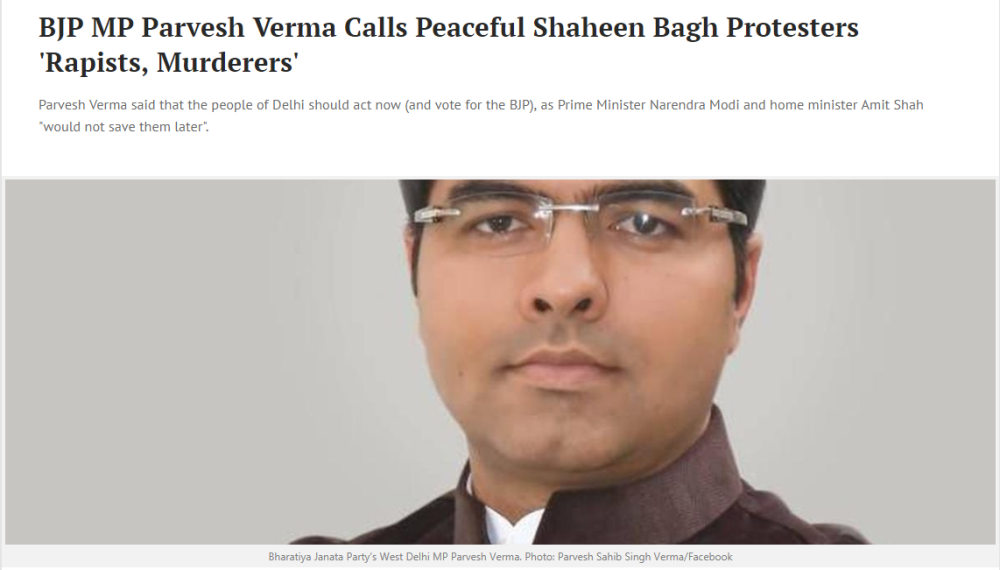 来自印人党的人民院议员帕尔韦什·韦尔马(Parvesh Verma)在一周时间内因发布煽动性的言论连续两次被选举委员会禁止参与竞选活动。1月28日,韦尔马在接受ANI记者采访时,将沙欣巴格的静坐抗议者称为“强奸犯”、“谋杀犯”,引发了大众强烈的不满;一天后韦尔马在马迪普尔的一次集会演讲中控诉首席部长凯杰里瓦尔为“恐怖分子”,再次助推社会仇恨情绪的增长。