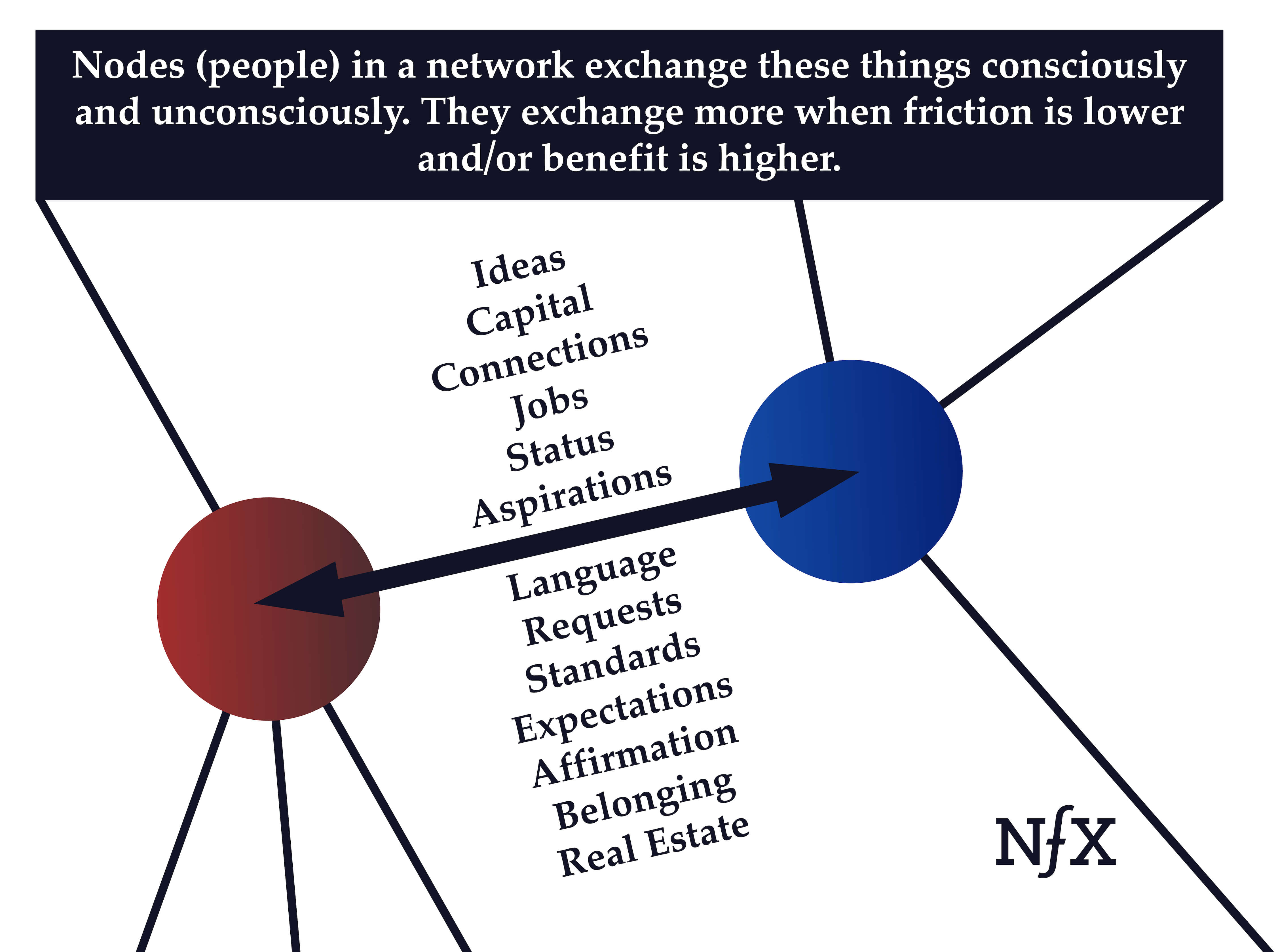 节点(在这里的情况下是人)要交换大量东西。有时是有意识地进行的,比如我通过银行账户转账给你,有时是无意识的,比如吃晚饭的时候你无疑中听到我告诉别人自己是如何边散步变给创始人提供指导,然后你决定在自己的员工身上也试一下的时候。