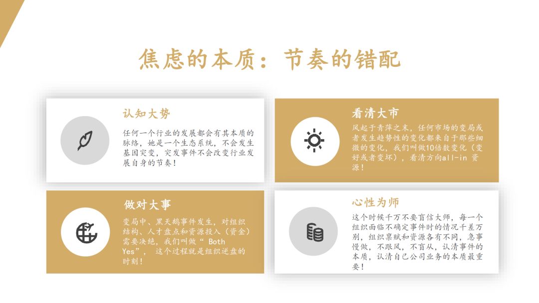 创业公司在面对类似此次黑天鹅事件的时候应该怎么做,主要围绕四个方面进行展开:认清大势、看清大市、做对大事、心性为师。