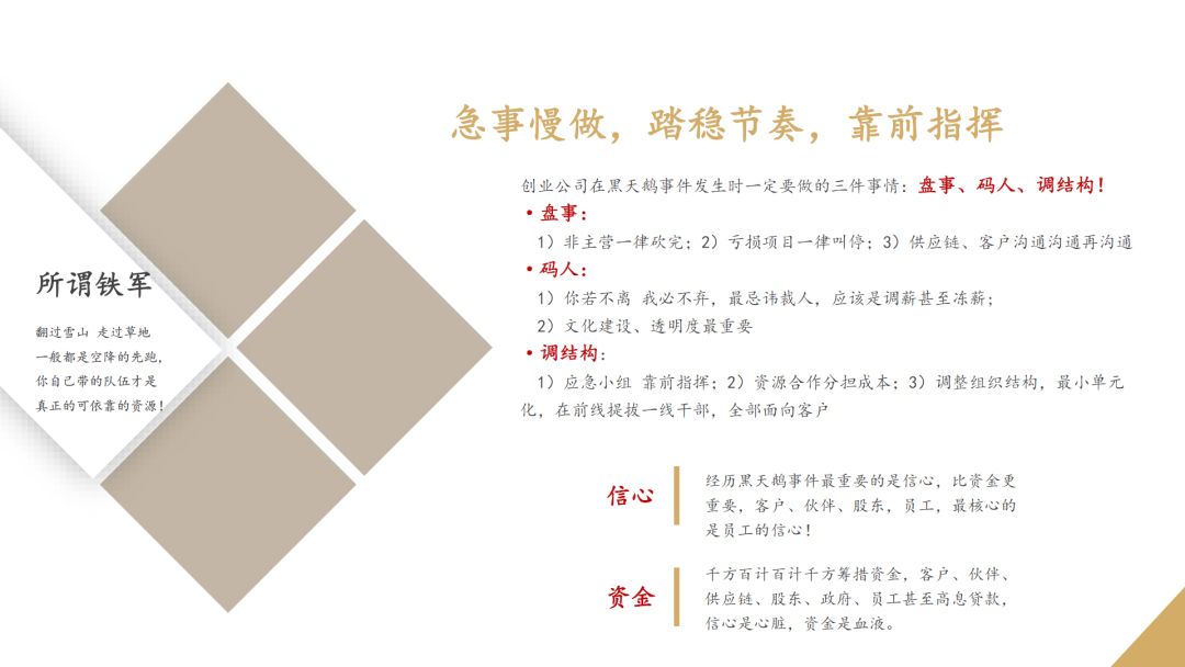 在出现问题的时候做对事情是最重要的,一定要踏准节奏。要急事慢做、踏稳节奏、靠前指挥。创业公司在黑天鹅发生的时候一定要做的三件事,盘事、码人、调结构。