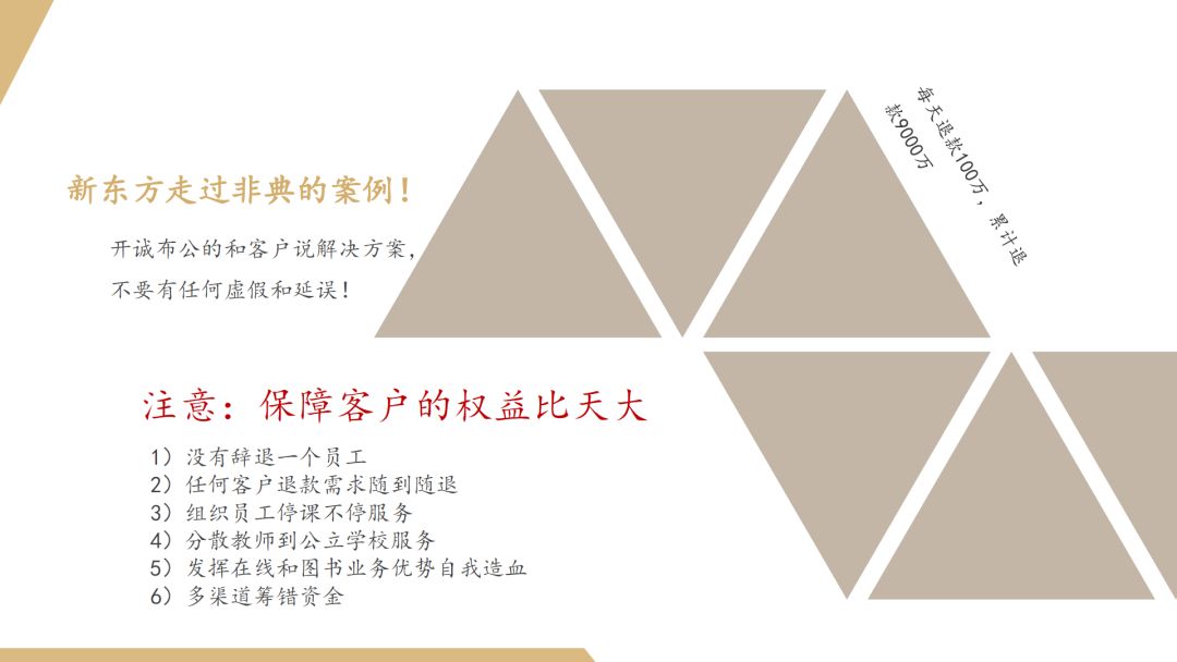 新东方的案例:在非典发生的时候,新东方每天退费达到100万,最后退费总额达到9000万。新东方当时做了一件非常重要的事情,就是和所有的客户说,如果要退费的话我们可以100%退,但是学习还是要继续,我们开诚布公的和客户讲,让客户去做出选择,要么延课、要么退费,保证客户的权益比天大。最后退费的用户占20%,80%的学员是没有退费的。