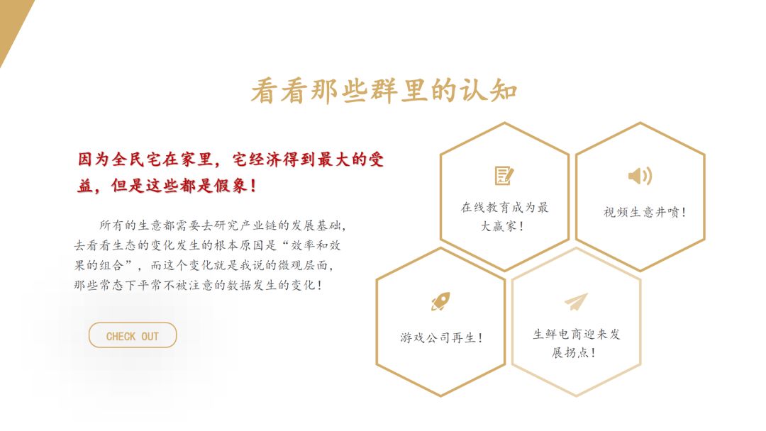 问题的本质是突发事件让大家宅在家里,所以宅经济一定会发展起来。大家都说今年的赢家是在线教育,是短视频和游戏,视频网站会员和游戏充值达到了巅峰,生鲜电商例如叮当买菜,订单根本接不过来。但核心问题还是在于人们不能出门,只能宅在家里。