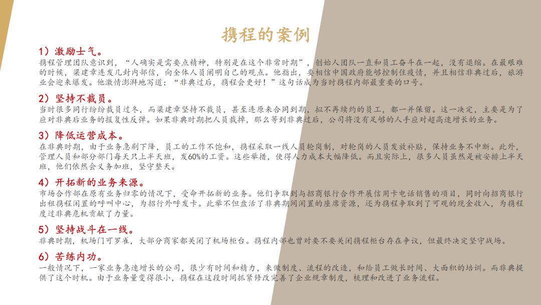 第三,调结构。成立应急小组,靠前指挥;资源合作分担成本,例如盒马鲜生和西贝,员工外包,共赢合作;调整组织结构,把一线的部门整合成一个个的小单元,所有的人都要面向客户,因为留住客户才是东山再起的资本。这个时候我们会发现一线人员里有很多人都是可以提拔上来的,新东方当年出现的一批核心骨干都是非典期间提拔上来的。