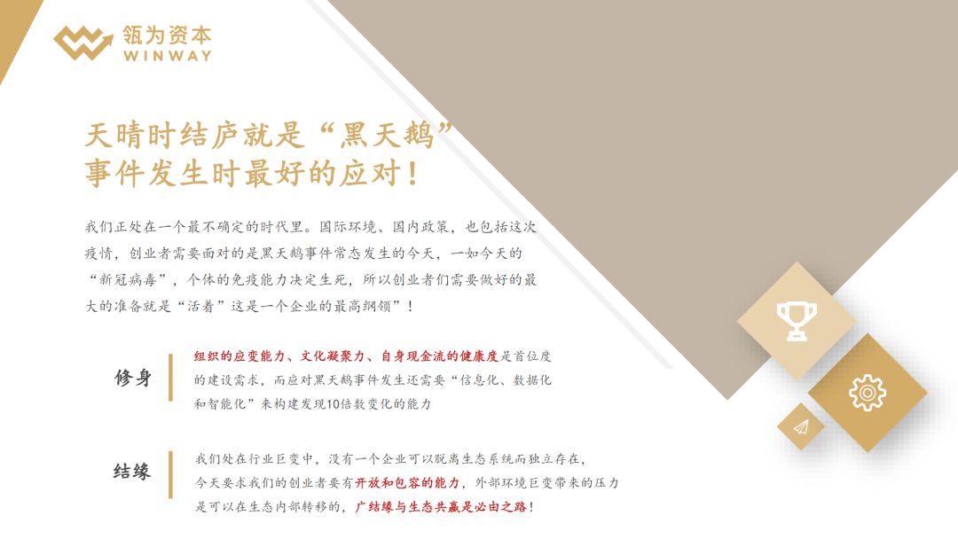这种做法可以让创业者形成自己的方法论,在面对黑天鹅事件的时候不慌,找方法来解决。