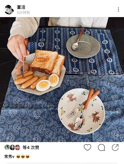 从董洁晒出的照片来看,在今天这个特殊日子她也专门准备了爱心早餐,有火腿鸡蛋和面包,营养搭配均衡,十分丰盛。与此同时,董洁还不忘好好布置一下餐桌,特意铺上了蓝色的小桌布,摆上精致的刀叉盘子,超具仪式感。
