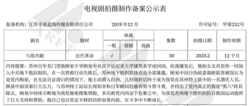 江苏广电下属幸福蓝海备案有当代情感剧《阿坝一家人》以及近代革命剧《与敌共眠》。
