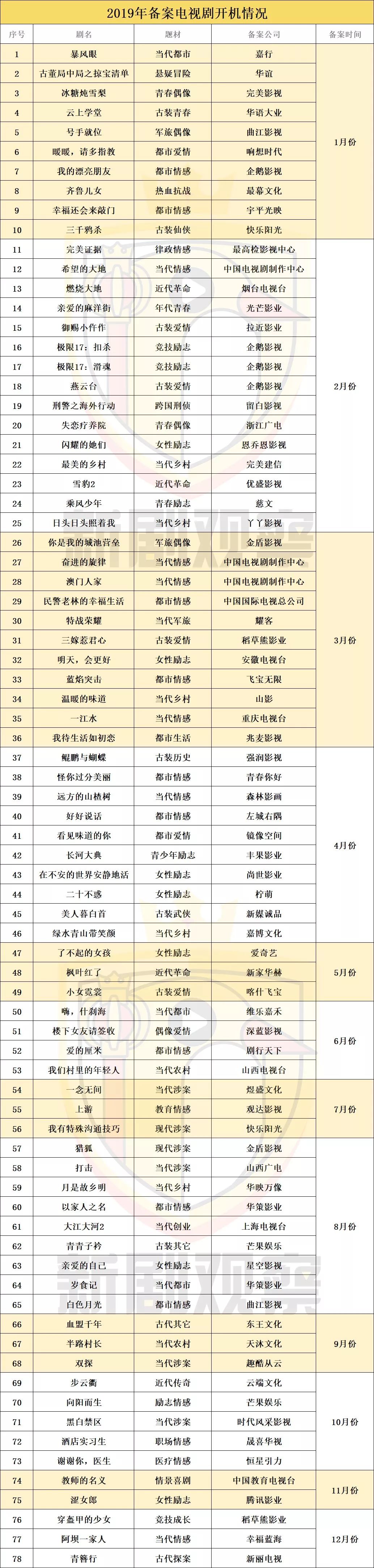 2019年备案的905部剧目中,目前已开机78部,仅占2019年备案剧目的8.7%左右。