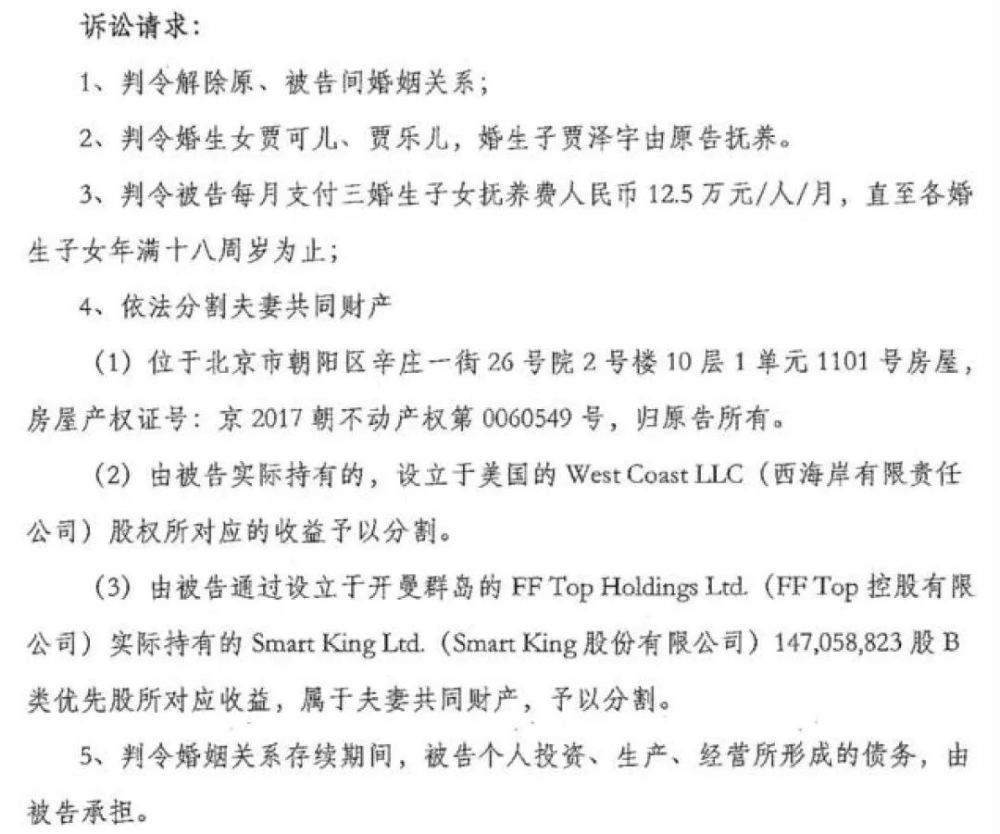 2019年11月14日,甘薇签署的一份起诉状显示,婚生子女将由甘薇抚养,贾跃亭需每月支付三子女抚养费12.5万元/人/月,直至18岁为止。