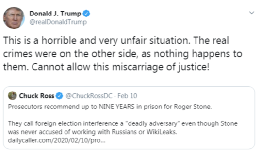 在斯通量刑减轻后,特朗普发布推特表示庆祝,并对巴尔“主导这个案子表示祝贺”,尽管从始至终巴尔都未公开在这个案子上发表态度。