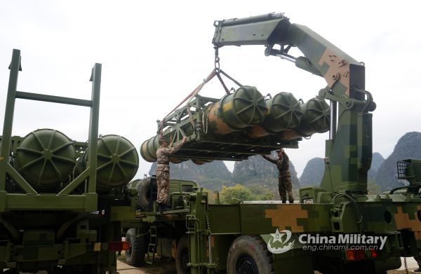 资料图片:中国陆军士兵正在演练吊装红旗-16防空导弹发射筒。(中国军网)