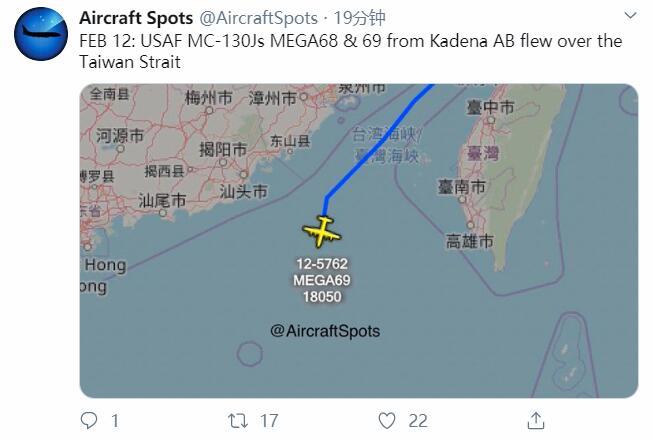 不过据长期跟踪美军战机动态的推特账号“飞机守望”(Aircraft Spots)2月12日提供的飞行路线显示,两架美国空军的MC-130J特种作战飞机当天从日本嘉手纳空军基地起飞,飞越台湾海峡上空。未标出此外的去向。