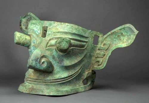 再说青铜纵目面具,这个面具的样子,现代人看来必定十分夸张,因为它两只眼睛呈柱状往外长长地突出,两边的耳朵则活像一对“招风耳”,而《华阳国志·蜀志》记载了:“蜀侯蚕丛,其目纵,始称王。”难道古蜀国的君王就长这个样子?