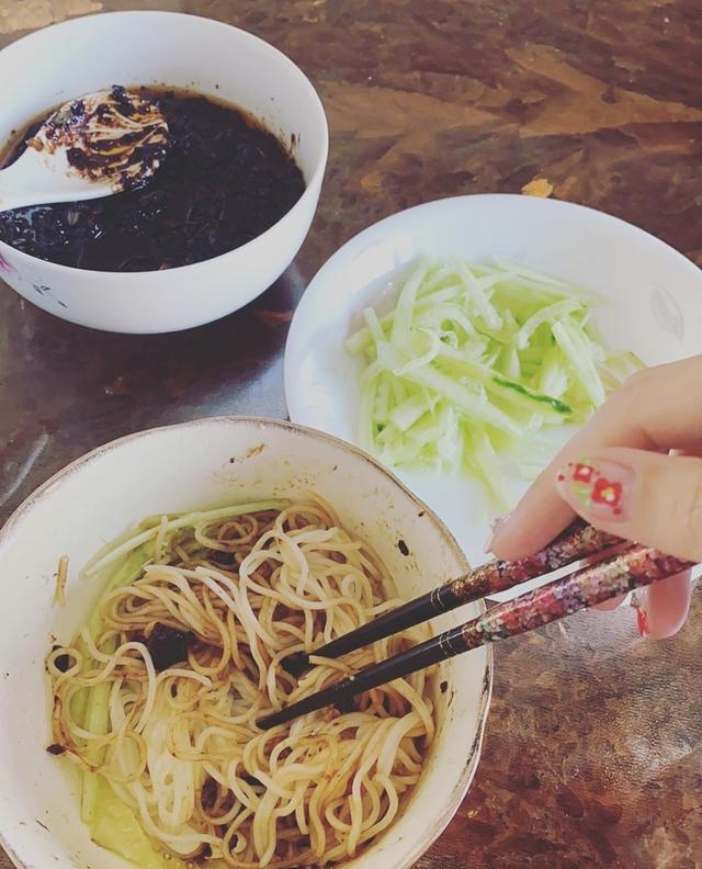 李小璐还做了拌面,简单随性,这大口的碗十分接地气,不知道对于甜馨来说,营养够不够。