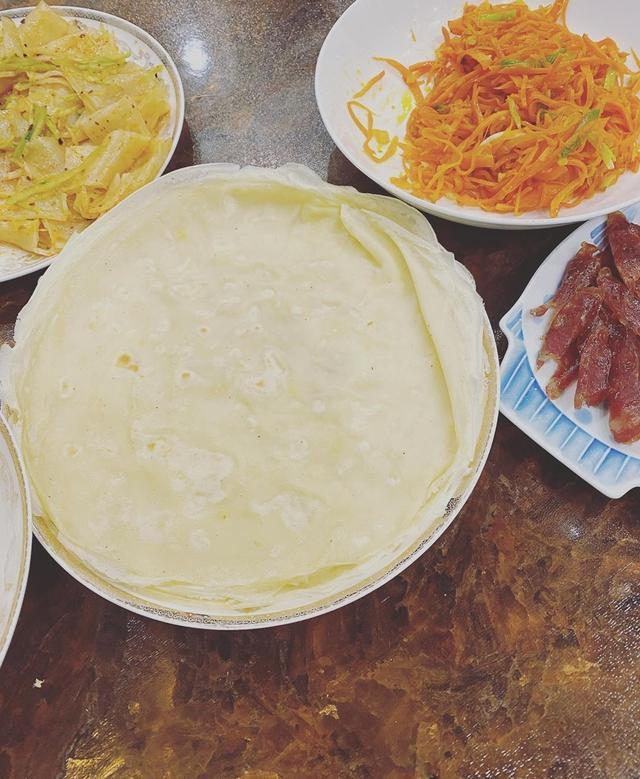 宅在家里还能自制凉皮,话说李小璐会得是不是有点儿多啊,自己烙的饼一层又一层,吃法像极了卷烤鸭。