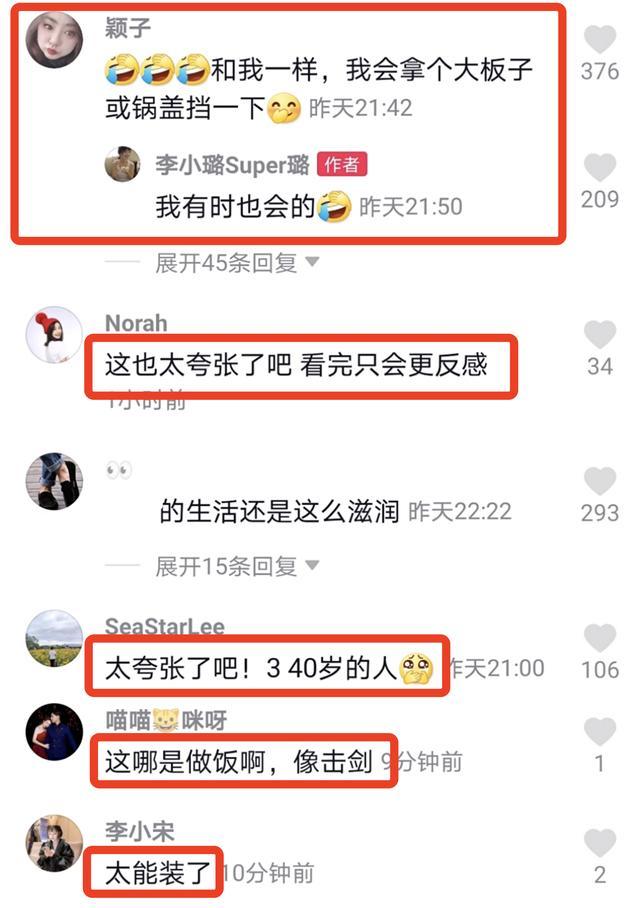 同时评论里也有不少网友表示李小璐这样只会让人更反感,都三四十岁的女人了还这样,这哪是做饭啊,像击剑,太能装了!
