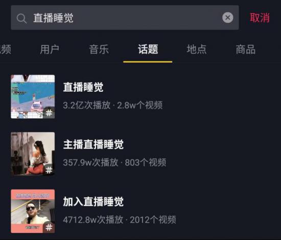 本着我行我上的想法,后继模仿者不计其数。抖音数据显示,「直播睡觉」进阶成为热门词条,与其相关的的播放高达3.2亿次,多达2.8万个视频。