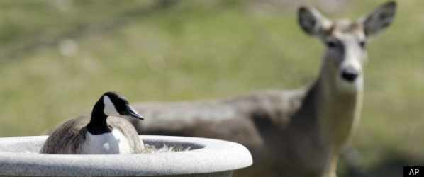 2011年,在布法罗的森林草坪公墓,筑巢的鹅和鹿之间出现了一种不太可能的伙伴关系。 这只加拿大鹅把卵放在骨灰盒里,安顿下来孵化。 在某个时候,一头公鹿加入了母鹅,开始充当警卫。 每当有人走近筑巢的小鸟时,他都会保护自己以抵御威胁。 这种奇怪的行为持续了三个星期,直到幼鹅孵出为止。 鹅妈妈开始与婴儿们一起走来走去时,鹿便步入森林,做得很好。