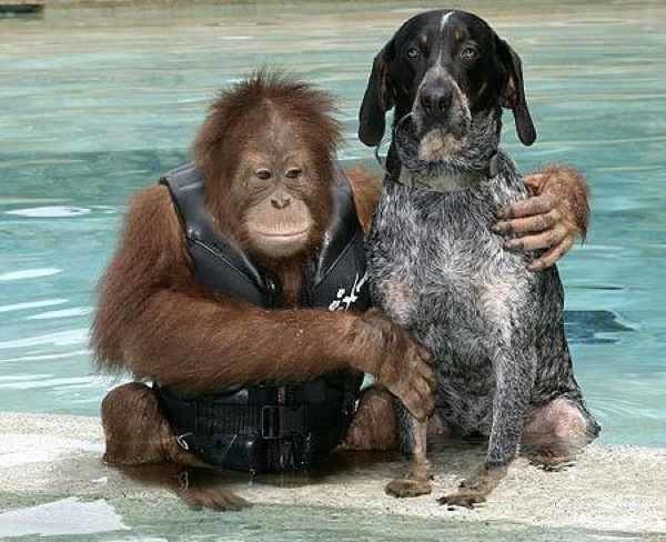 红毛猩猩Suryia和狗Roscoe在南卡罗来纳州的一个避难所里一起饲养。 当苏里亚(Suryia)发现无家可归的罗斯科(Roscoe)徘徊在动物中心时,两人相遇。 饲养者决定收养这只狗,并允许他与Suryia在一起,给灵长类动物一些友谊。 红毛猩猩非常聪明,不愿独自一人。 网上也有一对大象的照片,他们正骑在大象的背上,大象也住在圣所。 这两只动物已经成为一本书的主题,被用来为他们的共同住房筹集资金。