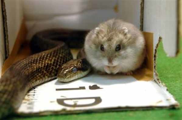 在许多国家,将活体脊椎动物饲养给其他动物是非法的。 但是,在日本,允许将活的啮齿动物饲养为蛇。 在东京动物园,仓鼠被放进了一条蛇的玻璃容器中,这条蛇被称为青蝉,后者拒绝吃冰冻的老鼠。 老鼠蛇奥尚(Aochan)有望吃到一顿仓鼠,但他却独自一人。 仓鼠似乎并不害怕他的爬行动物,经常睡在Aochan上。起初,饲养员认为这条蛇可能出了点问题,或者他会及时吃掉仓鼠,但两个人却相伴了几个月 。 他们成为了动物园的景点,幸运的仓鼠被饲养员称为Gohan,意为“餐点”。